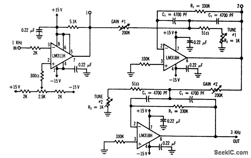 This circuit uses a comparator as a Schmitt trigger (311H) and two active bandpass filters LM318H).3-kHz output is obtained. Higher harmonics (preferably odd) can be obtained by tuning the active filters to the desired frequency.N can be 1, 3, 5, 7, 9, etc. Even harmonics can be produced by substituting a full-wave rectifier or absolute-value circuit for the Schmitt-trigger comparator.
