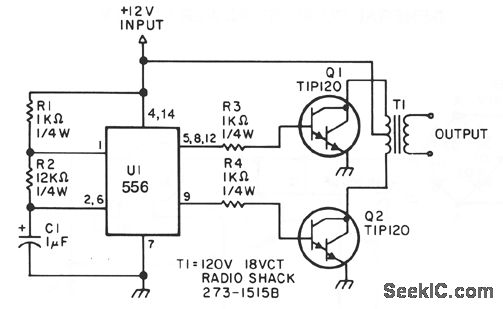 This low-power inverter uses only 9 parts and turns 10 to 16 Vdc into 60-Hz, 115-V square-wave powqr to operate ac equipment up to 25 W. The first section of the 556 timer chip is wired as an astable oscillator with R2 and C1 setting the frequency. The output is available at pin 5. The second section is wired as a phase inverter. That output is available at pin 9. Resistors R3 and R4 keep output trans;stors Q1 and Q2 from loading down the oscillator. The two transistors drive the transformer push-pull fashion.When one transistor is biased-on, the other is cut-off. The transformer is a 120 V/18 VCT unit that is connected backwards, so that it steps the voltage up rather than down. Oscillator circuit U1, R1, R2, and C1 operates from about 4 to 16 V with a very stable output.