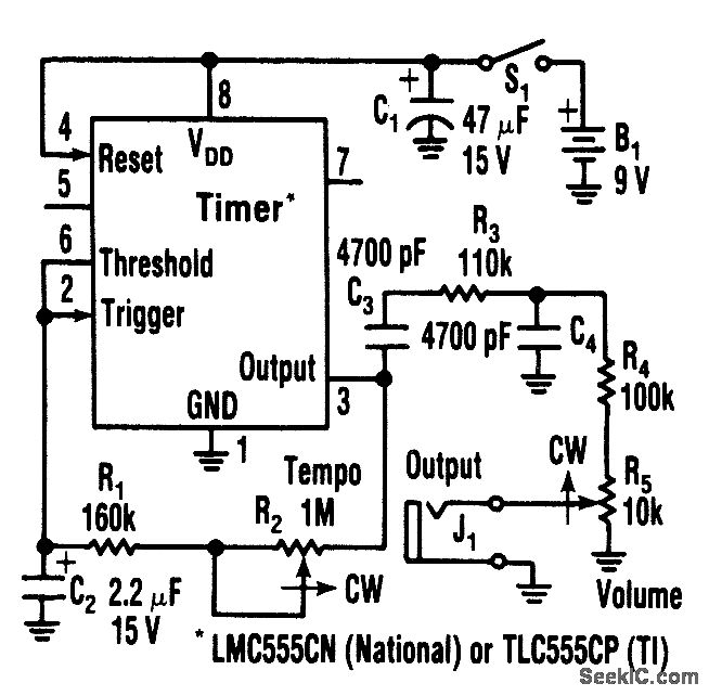 Using only 0.25 mA,this metronome is idealfor battery operation.The tempo range is 34 to 246beats per mtnute.Use a CMOS timer, such as an LM555 CN Or TLC55CP.