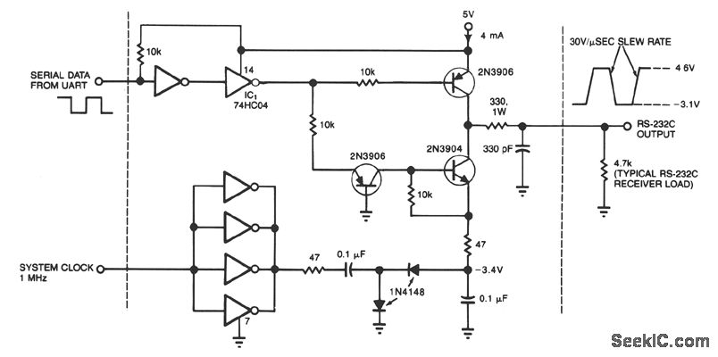 This circuit draws only 4 mA from a 5-V supply while driving a standard RS-232C receiver. The system clock drives a dc-dc converter that produces -3.4 V. The frequency can range from 0.5 to 8 MHz, but a range of 0.5 to 1 MHz will minimize power dissipation. The circuit output withstands direct shorts to ground or to either of the supplies (±12 V max). In place of the 74HC04 high-speed CMOS driver shown, you may want to substitute miscellaneous spare gates; one noninverting buffer, for example, can replace the two inverting types that receive the UART signal.