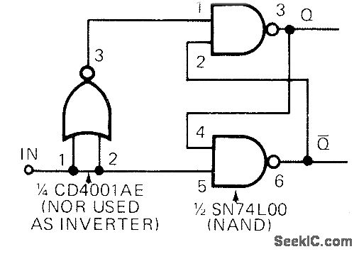 Uses two NAND gates from SN74L00 NAND package and one NOR gate (used as inverter) from CD4001AE CMOS package to make low-power Schmitt trigger. NAND gates are connected to form RS flip-flop. Q goes high when input voltage is greater than 2.1 V, and other output does not go low until input voltage is less than 1.2 V.Both polarities of output signal are available.-R. Cox, CMOS and LPTTL Gates Make LowPower Schmitt Trigger, EDN Magazine, Oct. 1, 1972,p48.