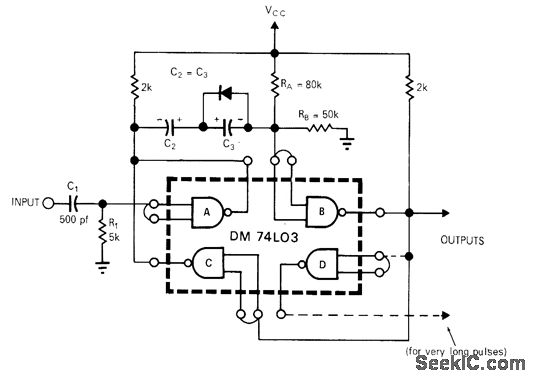 Simple monostable circuit using DM74L03 draws only 800-μA standby current yet delivers pulses up to 1 s wide. Uses RC time control and regenerative feedback, with values of C2 and C3 determining frequency. Pulse width increases from 0.1 s to 0.55 s as C2 and C3 are increased from 10μF to 60 μF.-C. Gilbert and C. Davis, LPTTL One-Shot Yields Wide, Clean Pulses, EDNIEEE Magazine, May 15, 1971, p 47-48.