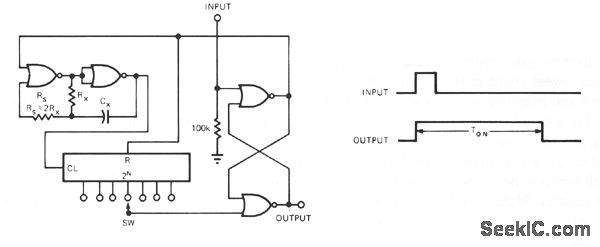 This CMOS circuit can be used as a 1-shot time delay switch and general-purpose timer. The circuit consists of a gated oscillator and a latch made from one CD4001 quad 2-input NOR gate as shown and a CD4020 14-stage counter. TON is a function of the oscillator frequency from the RxCx and the proper 2N output from the counter. A pulse applied to the latch will enable the oscillator and counter. The latch output will remain high until the 2N count resets the latch and disables the oscillator and counter. The circuit provides μs to hour interval timing. The extraordinarily long periods available from the CMOS oscillator, combined with the 14-stage counter, make this range possible. Further decoding is required for variations finer than a power of two.