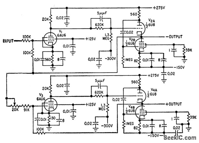 Tubes V1 and V2 provide single-phase inversion with output impedance below 0.5 ohm over 50.kc poss bond when feedback loop is dosed. Output of V2 feeds identical combination V3-V4 to provide second output in phase with input to V1. Trim adjustment is provided to insure unity gain for both outputs. Used in automatk doppler cycle counter for measuring position and velocity of missiles.-B. E. Keiser, Digital-Countor Techniques Increase Doppler Uses, Electronics, 32:21, p 46-50.