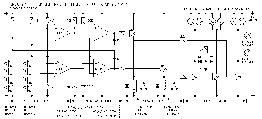 The circuit shown here is a later and simpler version of the protection circuit. Included are signal lights, these are optional but do indicate who has the diamond.