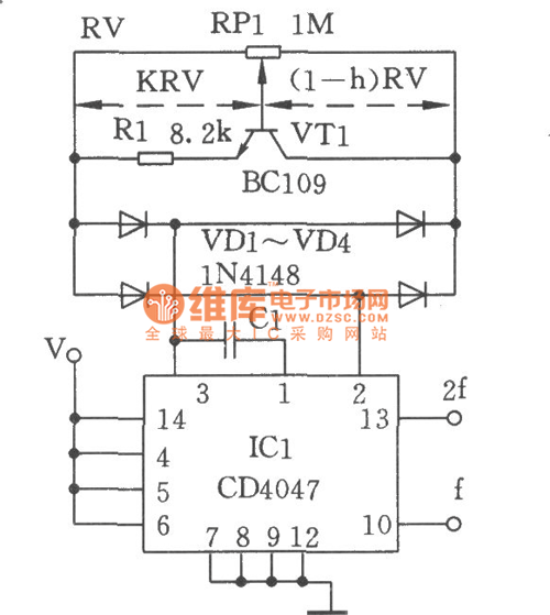 Figure shows the linear CMOS oscillator circuit. With the potentiometer RPl , the frequency of the CD4047 CMOS can be adjusted in the range of 1:100. When the transistor, which can be used as the variable resistor, is added, the adjustment circuit, which can have the linear relationship with the frequency, can be formed. The emitting resistor RI of VTI can set the current of IC with the variable base voltage. the electric bridge, which is formed by the diode VDl ~ VD4,is used to ensure the symmetry work both in negative and positive cycle.