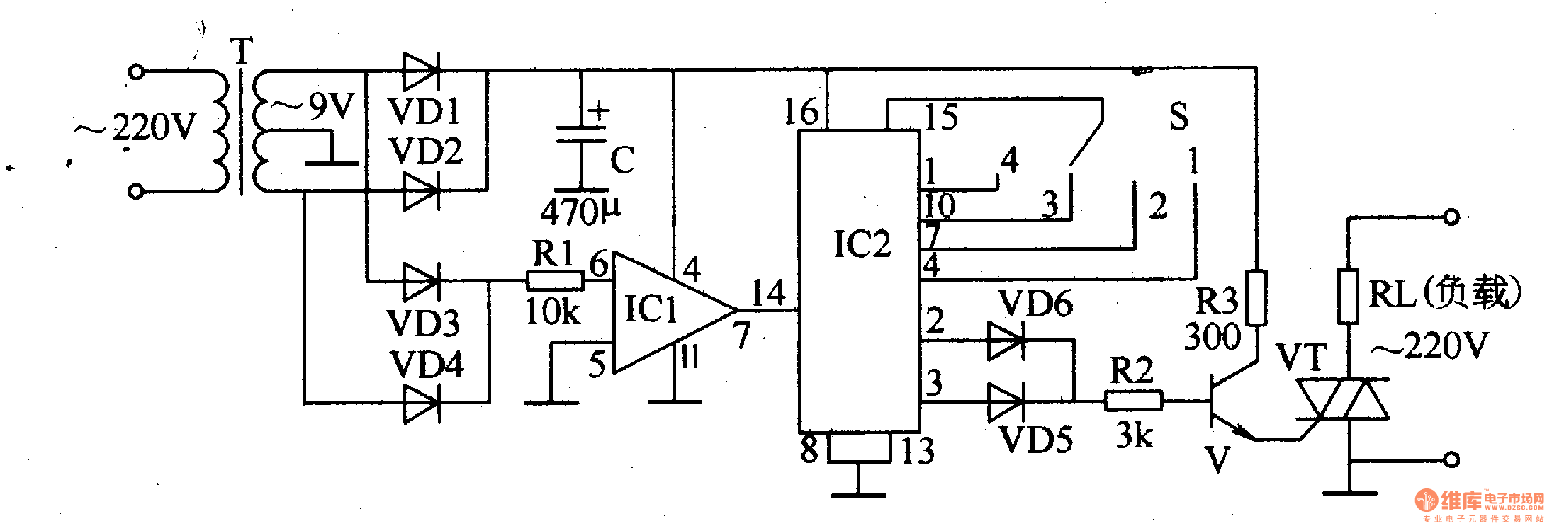 The bearing power adjustor circuit is composed of power supply circuit,zero passage test circuit and power regulation circuit and it is showed as the picture 5-54.The power supply consists of mains transformer,T,commutation diode,VD1 and VD2 and filter capacitor,C.