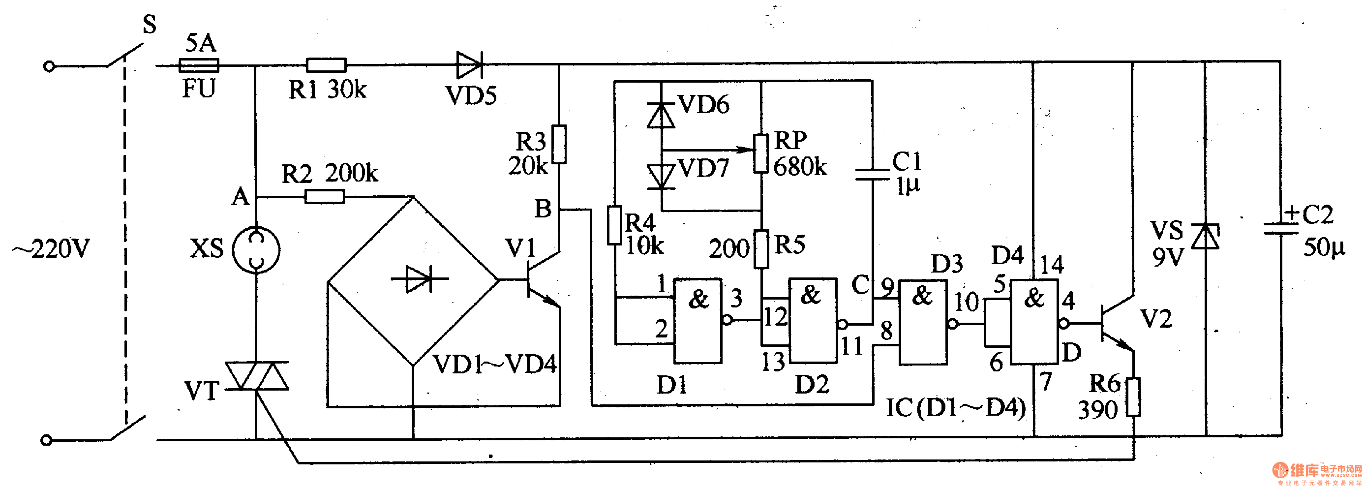 Circuit's Work Principle The bearing power adjustor circuit consists of power supply circuit,zero cross impulse detection circuit,multivibrator type oscillator,control operation circuit and it is showed as the picture 5-59.The power supply circuit is composed of power switch,S,fuse,FV,current-limiting resistor,R1,commutation diode,VD5,filter capacitor,C2 and voltage regulator diode,VS.