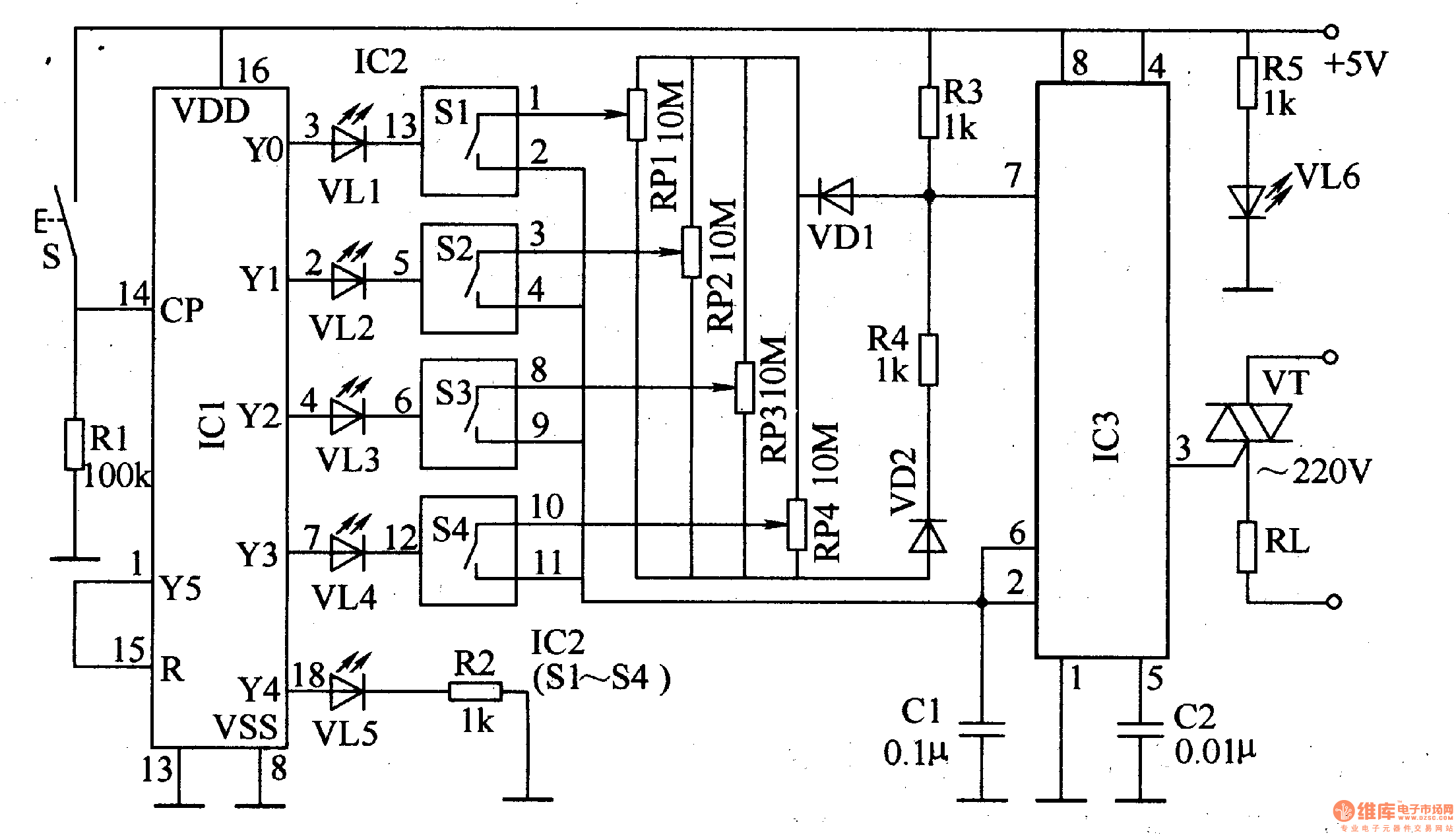 Circuit's Work PrincipleThe load power adjustor circuit is composed of input controller,electronic switching,astable multivibrator and control operation circuit and it is showed as the picture 5-56.The input controller consists of counter,allotter IC,IC1,control button,S,resistor,R1 and R2,LED,VL1-VL5.