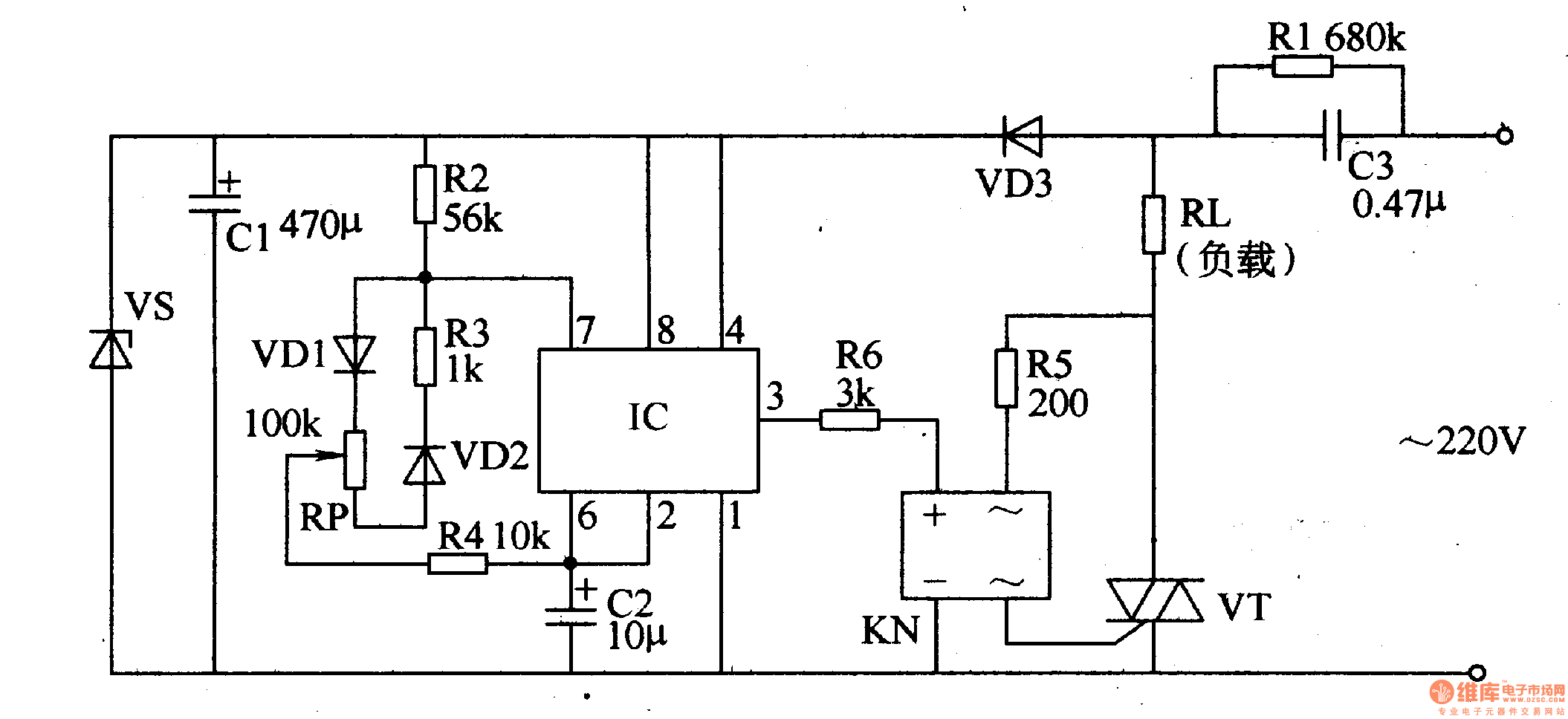 Circuit's Work PrincipleThe bearing power adjustor circuit is composed of power supply circuit,ultra-low frequency oscillator and control operation circuit and it is showed as the picture of 5-58.The power supply circuit consists of reduction voltage capacitor,C3,drain resistor,R1,commutation diode,VD3,filter capacitor and Zener diode,VS.