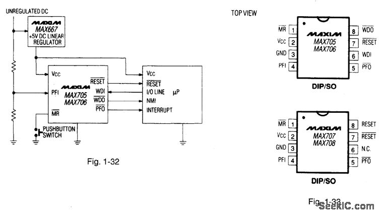 Figures 1-32 and 1-33 show a typical application circuit and pin configurations, respectively, for the MAX705-708. The ICs are similar to that described for Figs. t-J through 1-M, but with generally lower cost. The ICs have a 200-ms reset pulse width, 200-p, A quiescent current, and a 1.25-V threshold detector for power-fail warning, low-battery detection, or for monitoring a power supply other than +5 V.The MAX705/MAX707 generate a reset pulse when the supply is below 4.65V. The MAX706/708 generate a reset below 4.4V. The MAX707/708 is the same as the MAX705/706, except an active-high reset is substituted for the watchdog timer.The watchdog is activated when the WDI input has not been toggled within 1.6 s. MAXIM HIGH-RELIABILITY DATA Book, 1993, P. 5-31.