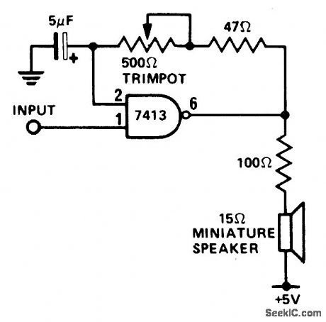 This circuit is useful for monitoring slow logic pulses as a keying monitor or digital clock alarm. The Schmitt trigger is connected as an oscillator. The trimpot controls the pitch of the output. When the input goes high, the circuit will oscillate.