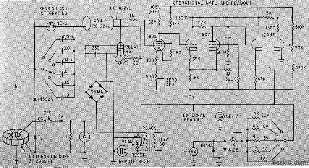 Gives current integral of one or more pulses, for measuring quantity of electricity in coulombs, regardless of pulse shape and independently of ground connection or circuit potential. Commercial d-c electrometer may be used in place of operational amplifier. Range switch is at pickup.-J. F. Howell, How to Measure Coulombs in Irregular Pulses, Electronics, 35:32, p 72-73.