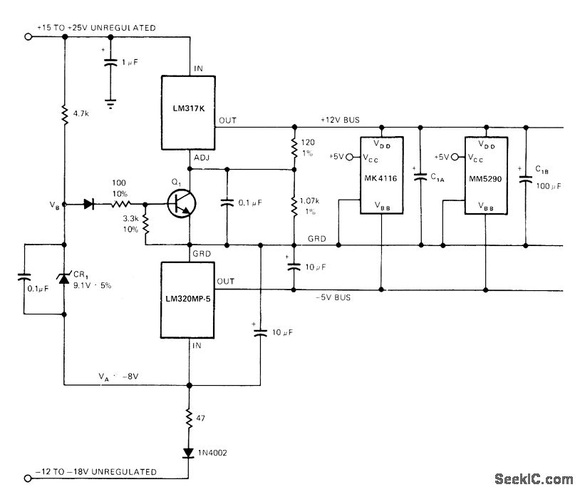 Developed for MOS RAM in which accidental removal of -5 V bias supply would allow buildup of currents flowing between +12 V and ground to value sufficient to open up metal paths and destroy memory. Protection is achieved by feeding unregulated negative voltage to on-card local regulator using LM320MP-5 to provide -5 V regulated bias for all memory chips. LM317K is used as +12 V regulator for delivering up to 1.5 A. If -12 V gradually drops out of regulation, a, turns on and pulls LM317K adjust pin to ground so output of this regulator drops to + 1.3 V and logic circuits are undamaged. If -12 V shorts to ground, capacitors on -5 V line hold up for several hundred microseconds so Q1 has time to turn off +12 V regulator. Use heatsinks for regulators.-R. Pease, Safe Supply Manages MOS Memories, EDNMagazine, Oct. 20, 1978, p 82 and 84.