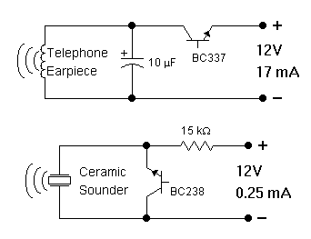 In order to generate a single note you may try these simple circuits. With only three components you may implement some basic buzzers. You need a telephone earpiece for the first circuit. Any old telephone set has got one of those magnetic earpiece that is right for our purposes. Add an extra capacitor and a transistor and you have your buzzer. Frequency of operation is about 1800 Hz and the capacitor must be changed if you wish to have a different frequency. The second circuit is implemented with a ceramic sounder: its intrinsic capacity is used to make another simple buzzer. Working frequency is 800 Hz and power drain is really low. The operating voltage is 9,5 - 20V for the circuit with the ceramic sounder and 8 - 16V for the other circuit. Do not expect a loud sound level: it is rather limited just as the current drain is. These buzzers are suitable for audio signaling on portable devices and wherever it is necessary to have a sound source implemented with a minimum components count. Not all transistors will oscillate: you have to use the specified type although I found that the BC109 and 2N2222A will also work albeit at a slightly different voltage.