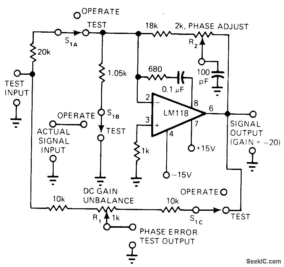 Phase compensation circuit trimmed by R2 keeps phase error of LM118 opamp well below 1° from DC to 200 kHz. In-phase error due to gain peaking is also low. Feed-forward network connected to pin 8 improves stability, making feedback capacitor unnecessary. Step response has about 30% overshoot, and sine response has about +1 dB of peaking before going 3 dB down at about 2 MHz.-R. A. Pease, Technique Trims Op-Amp Amplifiers for Low Phase Shift, EDN Magazine, Aug.20,1977, p 138.