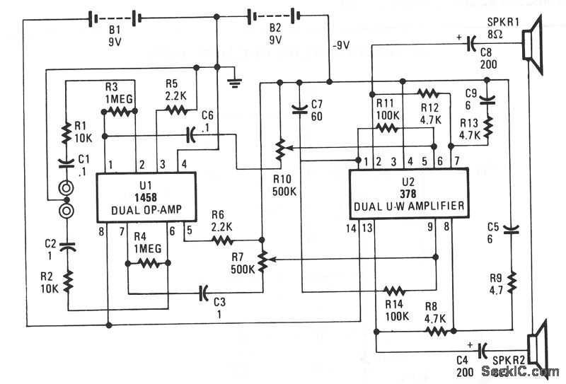 This circuit is built around two chips: the MC1458 dual op amp, configured as a preamplifier, and the LM378 dual 4-watt amplifier. The gain of the preamp is given by R3/R1 for one side and R4/R2 for the other side, which is about 100. That gain can be varied by increasing the ratios. The left and right channel inputs are applied to pins 2 and 6. The left and right outputs of U1 at pins 7 and 2 are coupled through C5/ R10 and C3/R6,respectively, to U2 to drive the two 8-Ωloudspeakers.