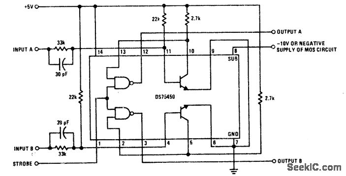 National DS75450 dual peripheral driver serves as interface between different logic types while providing highspeed switching and 300-mA output current per section Requires only single 5-V supply- Interface Databook, National Semiconductor、Santa Clara,CA,1978,p3-20-3-30