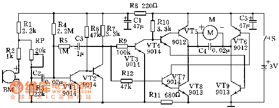 When no sound signal, delay control circuit of two transistors VT1 end, VT2 conduction, output low, through the VT3, VT4, VT7, ultimately complementary driver transistor VT5, VT9 conduction, VT6, VT8 off, the motor M Forward, Voice UFO straight forward. R5, C3 is connected across the output of the delay control circuit (VT2 collector) to the input terminal (VT1 base), so that C3 is fully charged (the left and right being negative). When receiving the BM electret microphone sound signal, and outputs a positive pulse is coupled to the delay control circuit C2, VT1 conduction, VT2 off, the output from low to high, so that the drive tube VT5, VT9 off, VT6, VT8 conduction, motor M reversal, Voice UFO backwards. Voice UFO front wheel bracket designed as a special structure, making the front wheels automatically when reverse deflection angle, so voice flying saucer at the same time that their own turn backwards. Because of the delay before the network R5, C3 exists, the sound signal disappears, the delay control circuit outputs remain high for a few seconds, Voice UFO turned backwards a few seconds to recover straight forward.