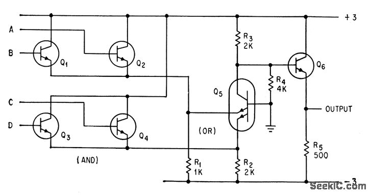 Circuit performs and function first, then or function. For integrated-circuit construction, few isolated lands ore needed.-P. M. Thompson, Logic Principles for Multi-emitter Transistors, Electronics, 36:37, p 25-29.