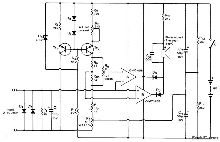 Uses small electric horn to produce sound when DC voltage being measured is different from reference voltage value determined by setting of linear wirewound pot R7. Blind person adjusts R7 for null in sound, then reads Braille dots for that setting to get value of voltage being measured. Use PNP silicon transistors, such as BC177 or BC187.D5 is 4.3.V 400W zener, such as BZX79/CAV3.Other diodes are small-signal silicon, sueh as BA100 or 1N914A.-G. P. Roberts, Multimeters for Blind Students, Wireless World, April 1974, p73-74.