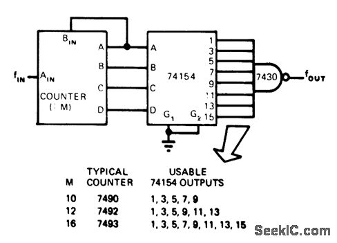 Three TTL circuits provide integral frequency-multiplication ratiosbetween1 and 8. BCD outputs of counter having modulus M are fed to inputs of 74154 4-line to16-line decoder.As outputs of counter change、at rate equal to input frequency divided by counter modulus M,each goes low at samerate Output of NAND gatethus goes high oncefor each input to gate from decoder.If 7490 decade counter is used and inputis 1 MHz,BCD outputs of 7490limit usable outputs of 74154 to lines 1,3,5,7,and 9.Since inputs to 74154 change at l00-kHz rate,output from gate will be n×100 kHz .With inρut of 25 MHz、output is integral multiple of 2.5MHz.-R .s Stein,Three TTLIC's Provide Frequency Multiplication,EON Magazine,April 5、1975、p 117 and 119.