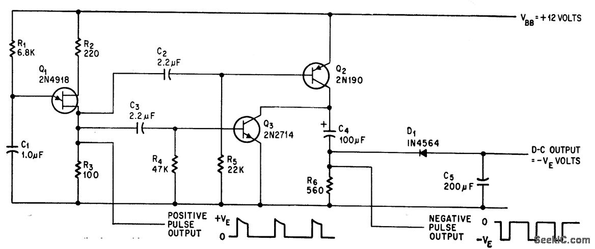 Circuit Provides negative d-c output voltage and negative output pulses, using only single d-c source .Unijuncation-transistor lator Q1 provides positive pulses, while Q2 and Q3 together invert these and drive rectifier D1 that gives -5 v at 1 ma to drive low-power amplifier that may be used in same integrated circuit.-M. H. Hussain, Circuit Inverts D-C Voltage, Electronics, 38:19, p 100.