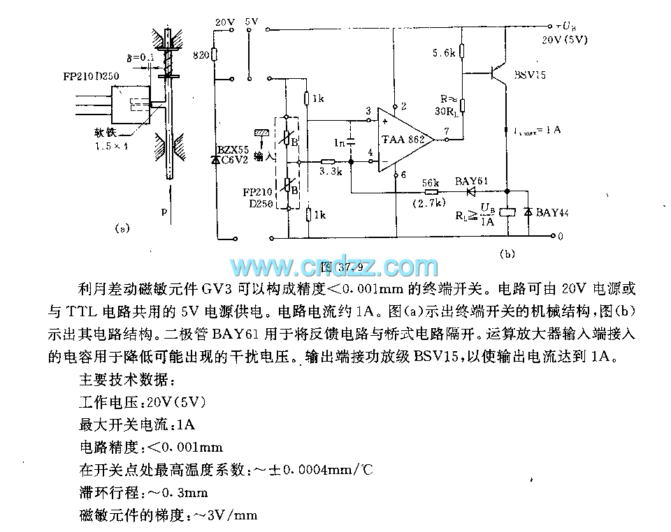 The differential magnetic sensing element GV3 can constitute terminal switch with accuracy <0.001mm. The circuit can be supplied by 20V power supply or 5V power supply shared with TTL circuit. Circuit current is about 1A. Figure A shows a mechanical structure of the terminal switch, b shows the circuit structure. Diode BAY61 is used to separate the feedback circuit and bridge circuit. The capacitor connected to the op amp input terminal is used to reduce possible interference voltage.