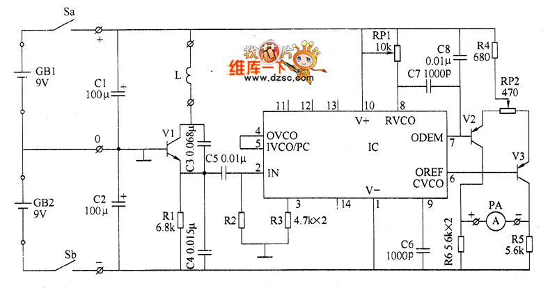 The metal detector circuit is composed of the power circuit, sine wave oscillator, PLL phase-locked loop circuit and hybrid amplifying circuit, and the circuit is shown as the chart. Power circuit is composed of the batteries GBI, GB2, filter capacitors C1, C2, and the power switch s (Sa, Sb). Sine oscillator circuit consists of transistor VI, detecting coil L, capacitors C3 ~ C5 and resistors RI, R2. PLL phase-locked loop circuit IC consists of dual time-base integrated circuit and resistos R3, potentiometer RP1, capacitors C6 ~ C8. Hybrid amplifying circuit is composed of the transistors V2, V3, resistors R4 ~ R6, potentiometer RP2 and ammeter PA. R1 ~ R6 use l/4W or l/8W carbon film resistors.
