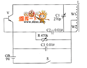 The metal detector uses LC single-tube oscillator circuit, and the circuit is shown as the chart. In the circuit, V is oscillating tube, L is the detection coil, C1 is the resonant capacitor. The LC single-tube oscillator circuit works after turning on the power switch S, the speaker of semiconductor superheterodyne radio will issue sounds with the frequency around 1kHz. When the detection coil L detects underground metal, the sound frequency of the speaker becomes high. R selects variable resistor. C1 uses variable capacitor (270P single sealed); C2 and C3 use high-frequency ceramic or glass glaze capacitors. V selects 3AG1 or 3AGll high frequency low power PNP germanium transistor. CB uses 9V tandem battery. Adjusting the resistance of R can make the operating current of machine be about 15mA.