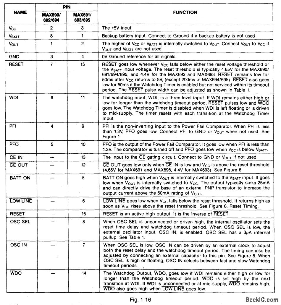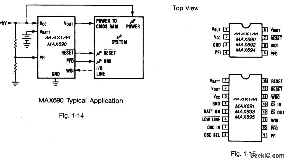 Figures 1-14 and 1-15 show a typical application circuit and block diagram, respectively, for the MAX690. The IC is similar to that described for Fig. 1-M, but also includes watchdog and battery-backup protection, and has a 1.3-V threshold detector, as shown in Fig. 1-16. Use the equations shown in Fig. 1-M to calculate the values for the resistors at the PFI input (except use a threshold of 1.3 V, instead of 2.54 V). MAXIM NEW RELEASES DATA Book, 1992, P. 5-19, 5-22.