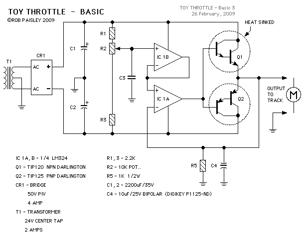 It would also be possible to have a spring loaded, one axis joystick type control that would automatically stop the train when the lever is released and as there is only one control it could be as large as desired. Again this might be helpful for someone who could not easily manipulate small controls or small children who would have an easier time with just one control.The above schematic shows the basic Toy Throttle. It is powered by a 24 Volts AC, Center Tapped transformer to provide PLUS and MINUS voltages.