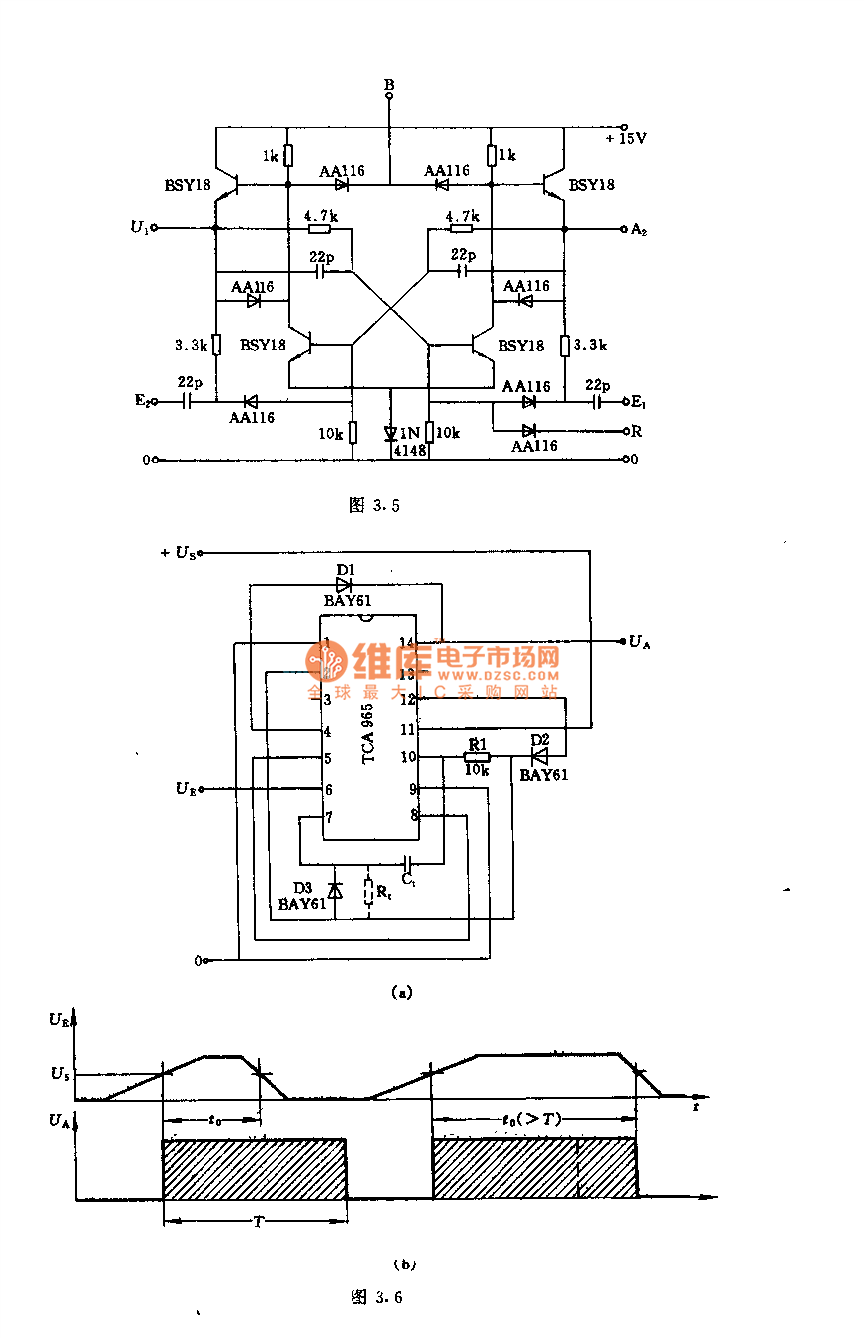 The integrated circuit TCA965's reference level U5 is provided by pin 8. If the input signal UE = U6 is less than U5 = U8, the output terminal pin 14 is in low level, and pin 2 is high ; if UE = U6 is high, then the corresponding U8 is decreased, the circuit makes the output flip. Figure b shows the input and output signal waveforms when output time is less( left) and greater (right ) than the monostable time constant. In the latter case, as long as UE = of U6 < U5, the output is immediately restored to low level.
