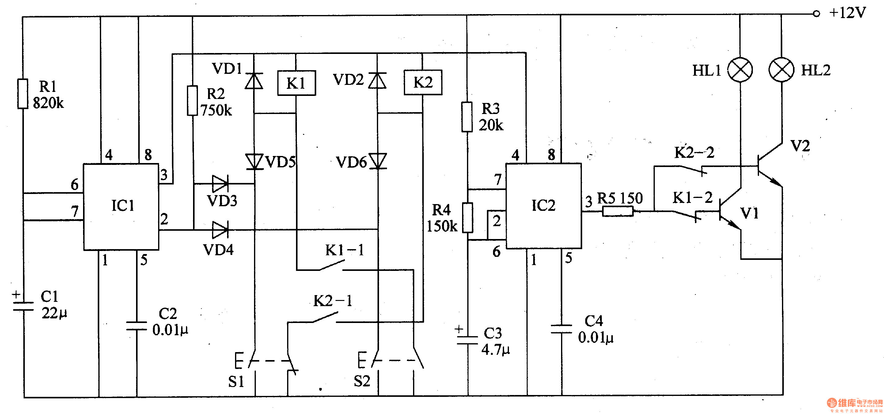 Control circuit is composed of the control button Sl, S2, the relay Kl, K2, transistors Vl, V2 and diode VDl-VD6.