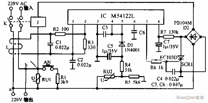 The multi-functional leakage protection switch uses Nissan M54122 which can constitute multifunctional leakage protection switch.The magnetic field is generated by flowing through front line and zero line and it is cancelled out and it does not produce AC current when there are leakage or an electric shock.And coil is produced and 7 feet produces high voltage level,which triggers controlled silicon and makes the relay action cut off power supply. Overvoltage protection is composed of Ru1,Ru2,Ru4,Ru5 and D1.Thermistor Ru1 is used to absorb the overvoltage caused by lightning or center line fault.