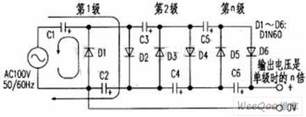 The Cochcroft&Walton circuit showed as the picture is a typical multiple voltage rectifier circuit.The half-wave voltage doubler comopsed of several diodes and capacitor connects in series and AC voltage charges and discharges capacitors C1~Cn in a half cycle in series-parallel way when it goes through diodes D1~Dn.Low ac input voltage can get several times of single half-wave voltage doubler's DC output voltage.Its work's principle:The mains supply charges C1 via D1 when it's negative half cycle.