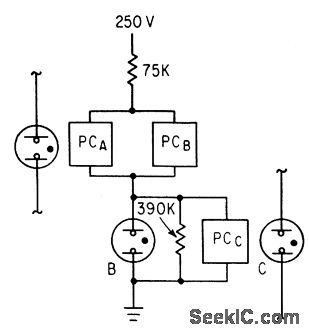 Cadmium sulfide photoconductor PC and Ne2H neon lamps give low-cost latch.When neon C is energized to provide input to PCA, neon B remains on, independent of input A, due to feedback from neon B to PCB. latch is reset by input to PCC.-J. L. Paterson, Will Neon Photoconductors Replace Relays in Low-Speed Logic?, Electronics, 36:18, p 46-49.