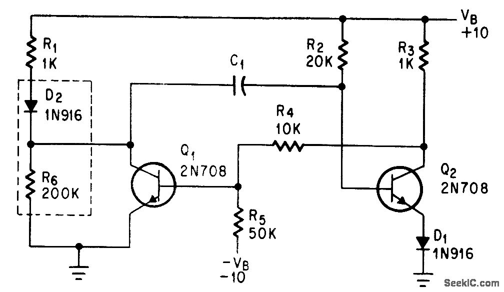 Diode in collector circuit makes monstable mvbr immune to most noise pulses.-B. D. Simmonds, Diode Quiets Input to Monostable Multi, Electronics, 38:19, p 99-100.