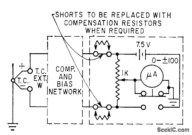 Potentiometer completes bridge circuit of simple lest set that checks thermocouple installations for thermal contact, electrical continuity, and correct polarity, without causing temperature change at thermocouple junction. Operation depends on resistance difference between thermocouple wires, which ranges from 6.5 ohms per 100 feet of 28-gage copper wire to 266 ohms for Chromel-P.-S. Meieran, Tester Chicks Out Thermocouple Circuits, Electronics, 36:11, p 102-106.
