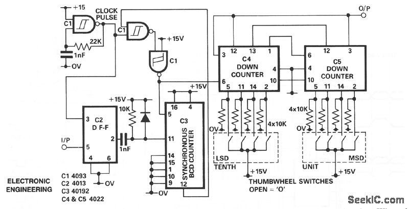 The purpose of D-type flip-flop IC2 is to synchronize the input signal with the clock pulse. When the clock pulse changes from low to high and the input is high, IC2 output is high. Subsequently, IC3 resets to zero and starts counting up. Until the counter counts to ten, the counter is inhibited. Thus, the number of pulses of the output of IC3 is ten times input pulse. The designed frequency of the clock pulse must be ten times higher than the maximum frequency of the input. IC4 and IC5 are cascaded to form a two decade programmable down counter. Since the number of pulses appearing at the input of the down counter is ten times the input to the divider, the effective range of the divisor for this divider is 0.1 to 9.9.