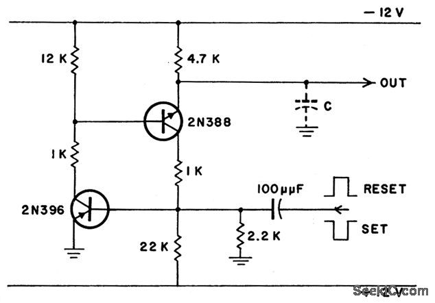 Used for transferring data into storage having heavy capacitive load, such as long connecting wires. Complementary con figuration, with load in emitter circuit of one transistor, makes stage trigger reliably in fraction of microsecond.-Non-Stalling Flip-Flop for Capacitive Load, Electronic Circuit Design Handbook, Mactier Pub. Corp., N.Y., 1965, p 213.