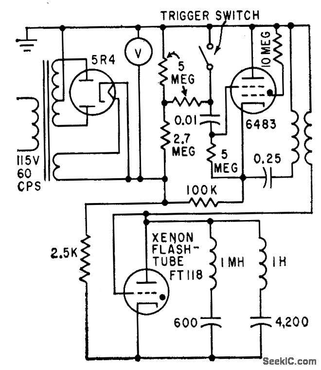 Uses xenon flashtube in double-discharge circuit to simulate thermal radiation pulse of nuclear explosion within atmosphere, which rises rapidly to first maximum, declines to minimum, rises to second maximum, then decreases gradually to zero. Used to evaluate atomic bomb alarm systems.-D. J. Baker and D. E. Thomas, Nuclear Thermal Pulse Simulator, Electronics, 32:44, p 66-69.