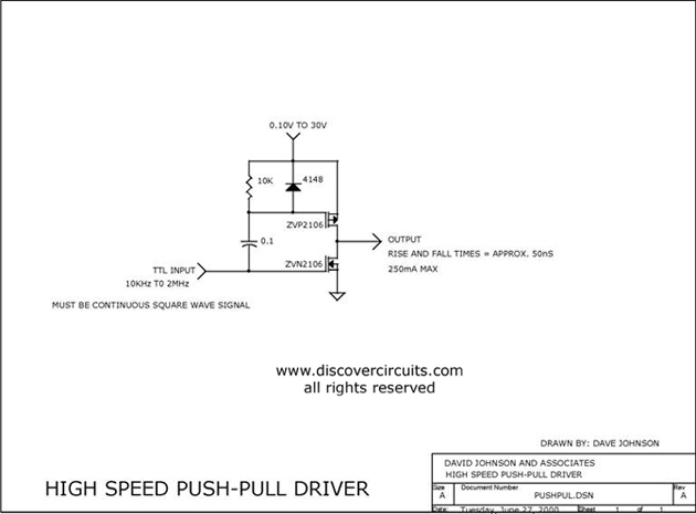 This circuit can produce high speed output signals with fast rise and full times. The unique change pump action allows the voltage of the upper P-ch device to range from millivolts to hundreds of volts. The output current is only limited by the rating of the transistors. I have used this circuit beyond 2MHz.
