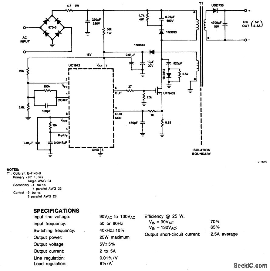 Circuit NotesThis circuit uses a low-cost feedback scheme in which the dc voltage developed from the primary-side control winding is sensed by the UC1842 error amplifier. Load regulation is therefore dependent on the coupling between secondary and control windings, and on transformer leakage inductance. For applications requiring better load regulation, a UC1901 Isolated Feedback Generator can be used to directly sense the output voltage.