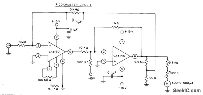 Current-to-voltage converter connection for CA3160 and CA31400 bipolar MOS opamps provides full-scale meter deflection for ±3 pA CA3160 is operated in guarded mode to reduce leakage current.CA3140 provides gain of 100 for driving zerocenter microammeter. With suitable switching, full-scale current ranges of 3 pA to 1 nA can be handled with single 10.000-megohm resistor in overall feedback path.-″Circuit Ideas for RCALinear ICs″RCA Solid State Division Someville,NJ,977,ρ 14.