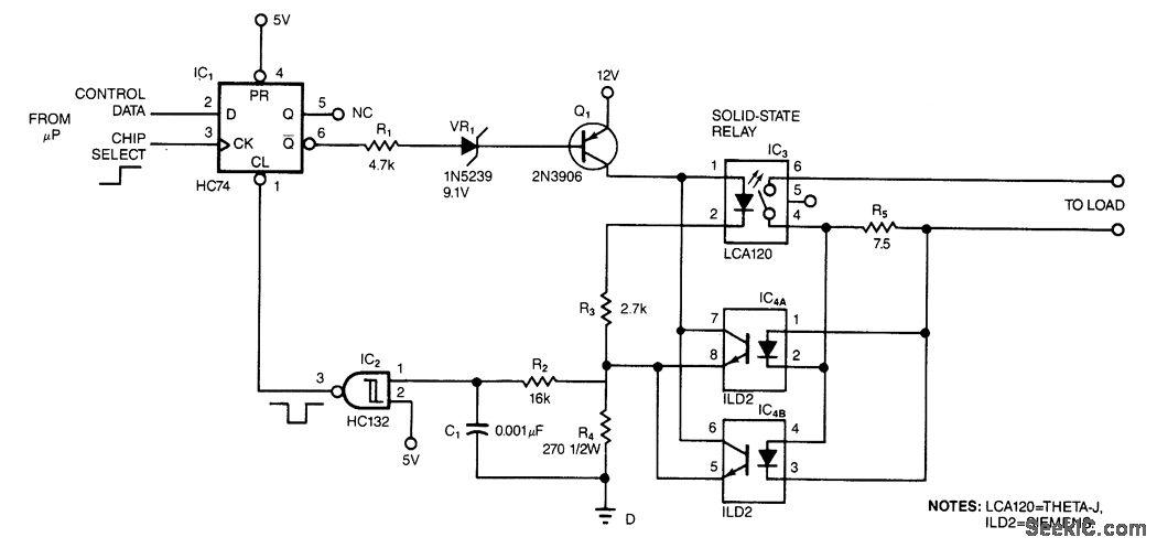 The circuit protects a solid-state relay from overloads. The circuit limits current, automatically discon-nects the load after detecting a short circuit, and develops a fault-condition output signal.In normal operation, the controlling ptP sets the flip-flop, IC1, which turns on transistor Q1. When Q1 turns on, current flows through the solid-state relay's input, thus activating the relay.If an overcurrent or fault condition occurs, the excessive load current flowing through the relay develops enough potential across sense resistor R5 to turn on one of the optoisolators, IC4A or IC4B. The optoisolator's output transistor diverts current around the solid-state relay's input, which limits the cur-rent that the relay's output can pass.If the overload is severe enough, the optoisolator pulls the input of the Schmitt trigger above its threshold, thus clearing the flip-flop and turning off the solid-state relay. R2 has two functions: It keeps the input of the Schmitt trigger below 5 V max. to prevent latchup, and it forms an RC filter in conjunction with C1. The RC filter prevents spurious triggering of the Schmitt trigger. You can use the output of the flip-flop to signal overload conditions to the controlling μP.