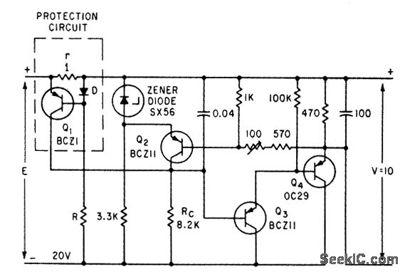 Protection circuit detects excessive load current and reduces output voltage proportionately. Values shown limit output current to 530 ma for short-circuit, while holding output voltage at 10 v during normal operation.-C. Yarker, Over. load Protection Circuit Uses low-Power Transistor, Electronics, 35:13, p 60.