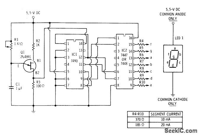 Can be used for classroom demonstration of digital logic driving 7-segment LED or as attention-getting desk display time base Q1 feeds sequential timing pulses to 7490 decade counter. Pulses are counted in binary mode, and bit pattern corre-sponding to digits 0-9 is fed to 7447 binary-to-decimal decoder/driver connected to 7-segment readout. Calibrate with watch or with timing reference signals from WWV, adjusting R1 so display advances 1 digit per second.-F. M.Mints, Electronic Circuitbook 5: LED Projects, Howard W. Sams, Indianapolis, IN, 1976, p 72-75.