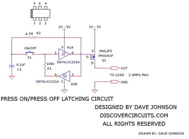 Often you want to turn on and off power to a device with a single pushbutton switch. The circuit below performs this logic function with just a few tiny parts and can operate from DC supplies between +2v and 5v. It uses two inverters within a 6 pin SN74LVC2G14 device from Texas Instruments. Each press of the button toggles between the two on/off logic states. The logic output is connected to a PMV65XP p-channel FET from Philips. This component should be able to handle 2 amps of current