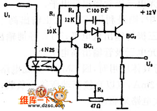 Graph (b) shows the circuit for the optical coupling switch Schmitt circuit. When the input voltage U1 is low, the optical transistor C and e are in high resistance, BG1 will be conducted, BG2 stops, the output voltage U0 is low; when the amplitude of the input voltage U1 is greater than amplitude discrimination value, the optical transistor c and e are in low resistance, the BG1 stops, BG2 will be conducted, the output U0 is high voltage. You can change the level of amplitude discrimination by adjusting resistor R3.